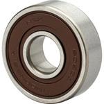 ベアリングの中で最も多方面に活用されている深みぞ玉軸受。深溝玉軸受は、内輪・外輪とも軌道は円弧状の深い溝になっておりラジアル荷重、両方向のアキシアル荷重、又はそれらの組合せである合成荷重を受けることができ、高速回転にも適しています。シールド形は、鋼板に合成ゴムを固着したシール板を外輪に固定しシール先端部は内輪シール面のV溝側面に接触している。