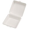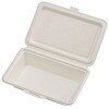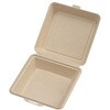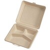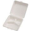 仕切りで3つのスペースに区切られた底深でボリュームたっぷりにご使用いただけます。一体折容器で、単品メニューにも、お弁当にも!幅広いメニューにご使用ください。 パルプモールド(紙)で出来たシャープなデザインのランチボックスです。 特殊モールド製法により両面を滑らかにすることで紙粉が出にくく、内側CPPラミ加工により、耐油性、防水性があります。電子レンジ対応です。 フタの縁が内側に落ちているので汁もれしにくい設計です。本体と蓋の境目に切り取り線があり、切り離しができます。