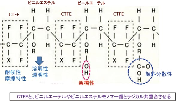 図5-66に示す3FのC-Cl結合は紫外線で劣化しやすいように感じるが、C-F結合がC-Cl結合を被覆するため劣化の起点にはならないようである。ルミフロン®は塗料用のフッ素樹脂ブランドになっている。一方、2Fのフッ化ビニリデン樹脂も通常の有機溶剤に不溶で、混合するアクリル樹脂(固形分混合比 アクリル/ 2F = 1/4程度)溶液中に分散されてスラリー状になっており、PCM鋼板用の高耐候性塗料として使用されている。塗膜は非架橋であり、図5-67に示す交互共重合性構造を持つ樹脂に比べ、低光沢で200℃程度の焼成が必要である。
