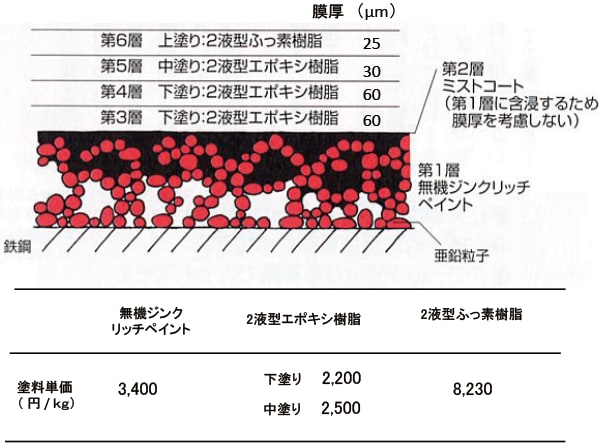フッ素樹脂塗料の価格はなぜ高いのか、と言う疑問には納得していただけたと思う。さらには実際の価格例を示したい。1998年に明石海峡大橋が完成した。塗装工事に関することは一般社団法人 日本橋梁・鋼構造物塗装技術協会が仕切り、積算資料としてまとめられた。著者が塗膜構成と塗料の単価(塗料1kgの価格)を抜粋し、図5-68にまとめて示す。フッ素樹脂塗料の単価は¥8,230で下塗り、中塗りエポキシ樹脂塗料に比べて3-4倍高いことが分かる。無機ジンクペイントの単価が高いのは予想外であった。次章では塗装系と言う目次立てをして、執筆したいと考えている。
