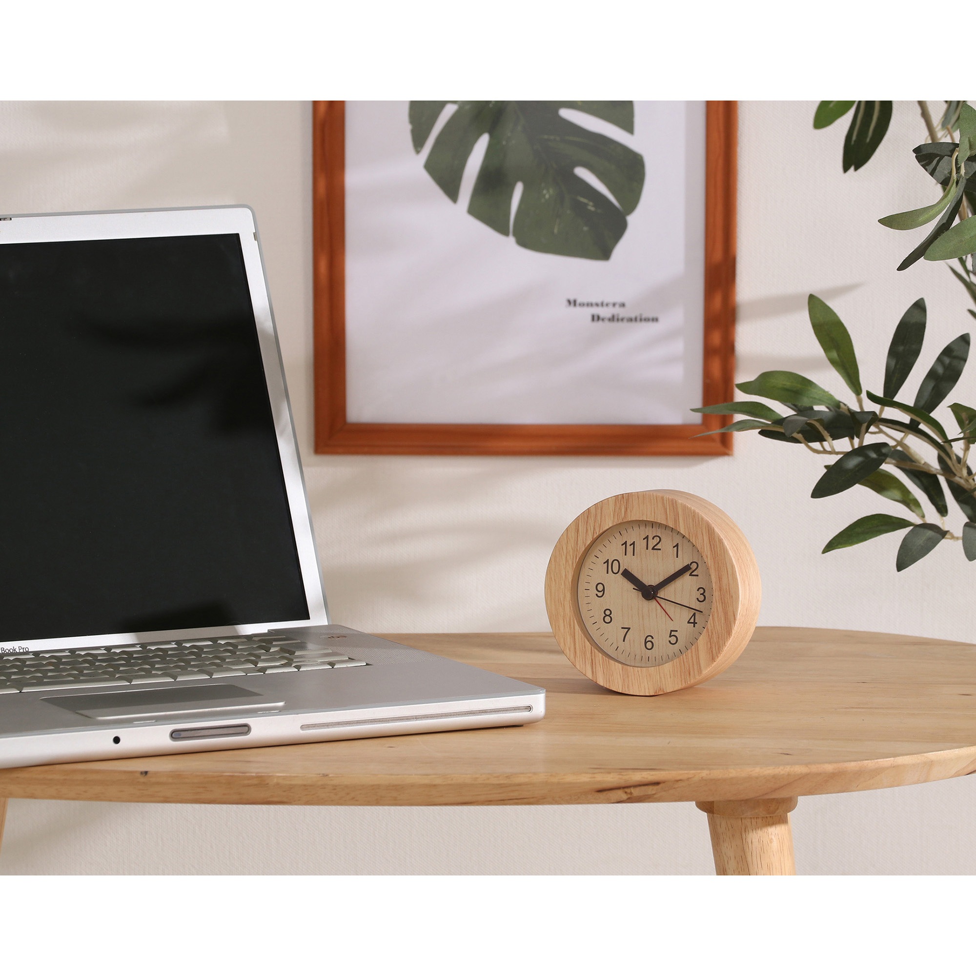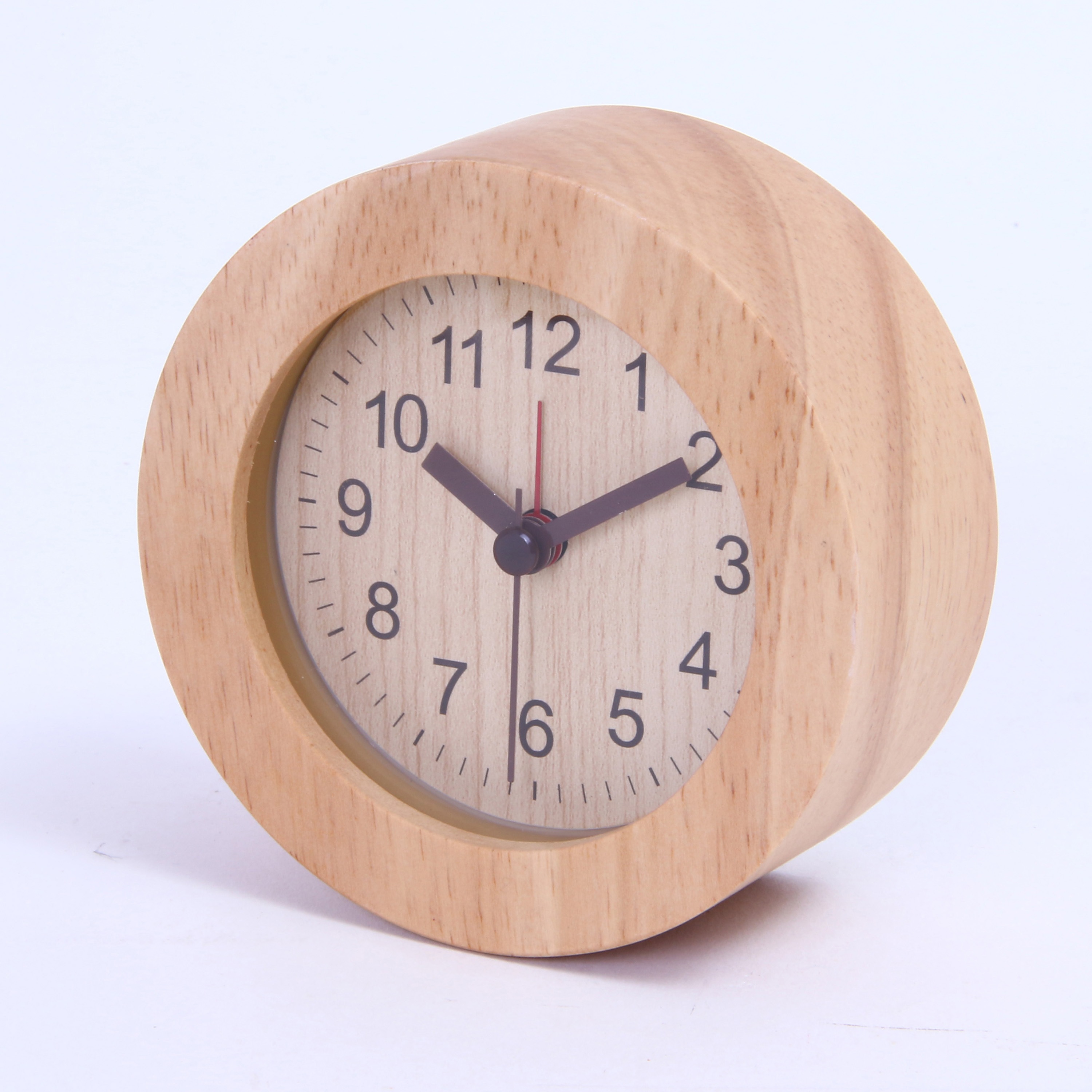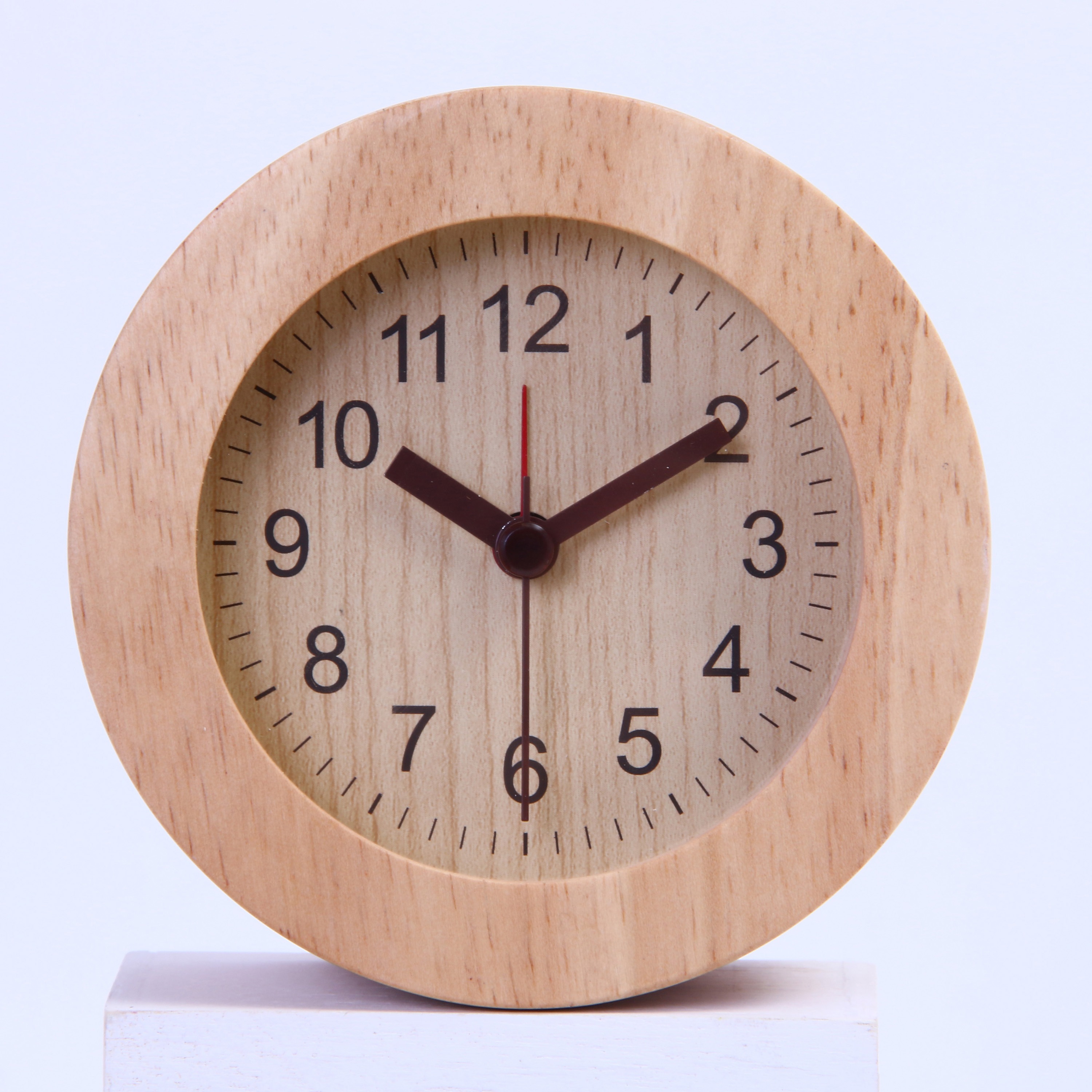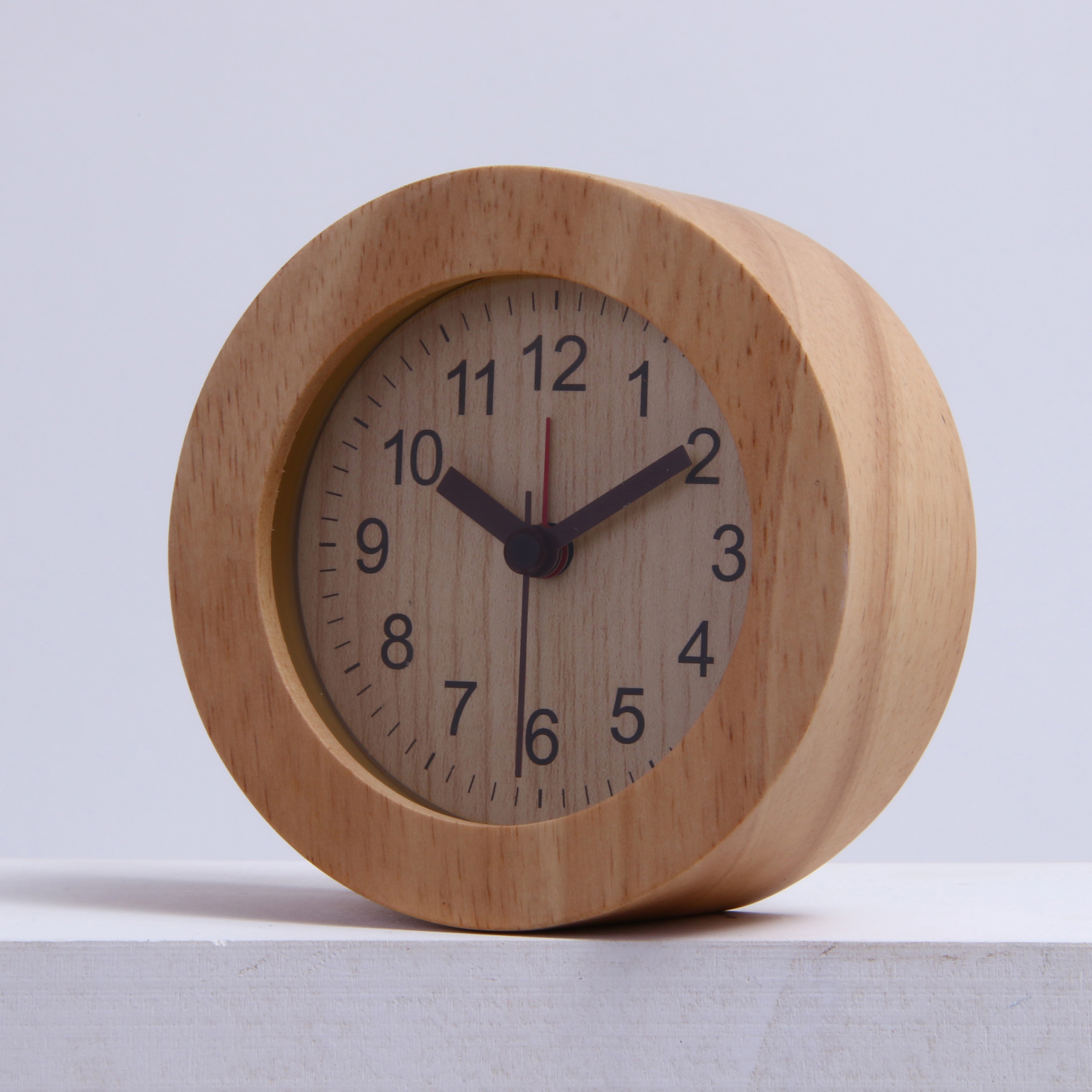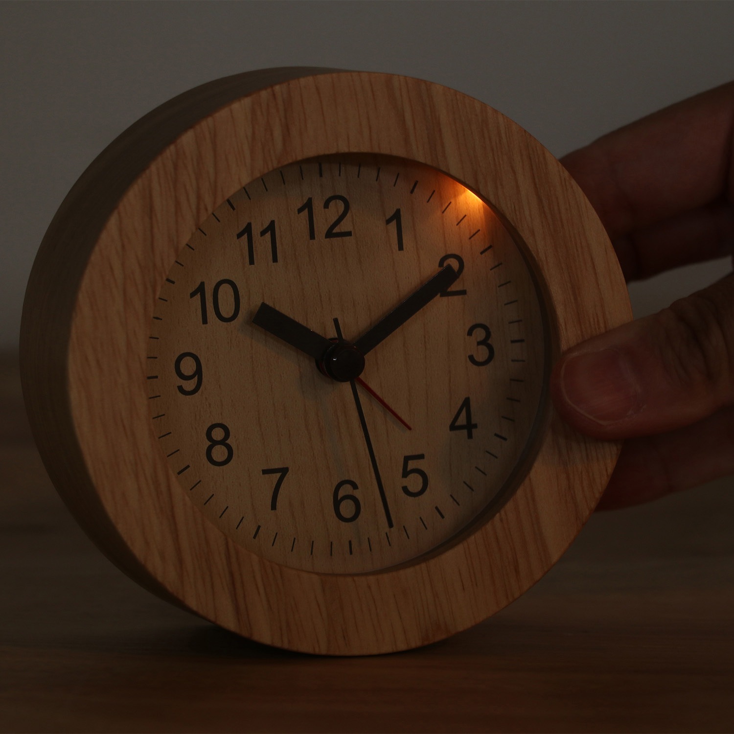 木目の優しいナチュラル置時計 天然木のフレームで、すっきりしたシンプルデザイン。長く使っていても飽きの来ないデザインです。 スイープムーブメントの秒針で音も静かです。 始めは優しく鳴り、4段階の変化をつけて音を届けます。背面のスイッチでアラームをオンオフできます。 背面のボタンでバックライトが光ります。暗い中でも時間の確認がカンタンに。 コンパクトサイズなので枕元だけでなく、デスクやサイドテーブルの上でも活躍します。 単三電池1本(別売)で動く、お手軽仕様。