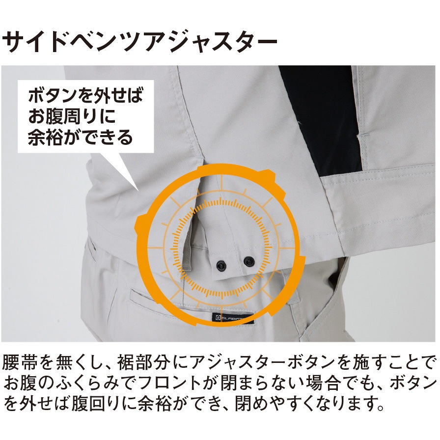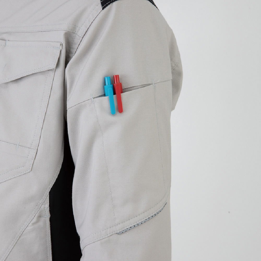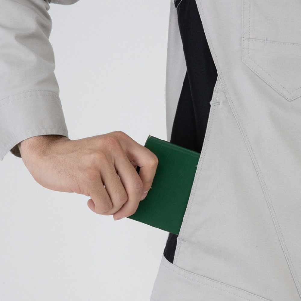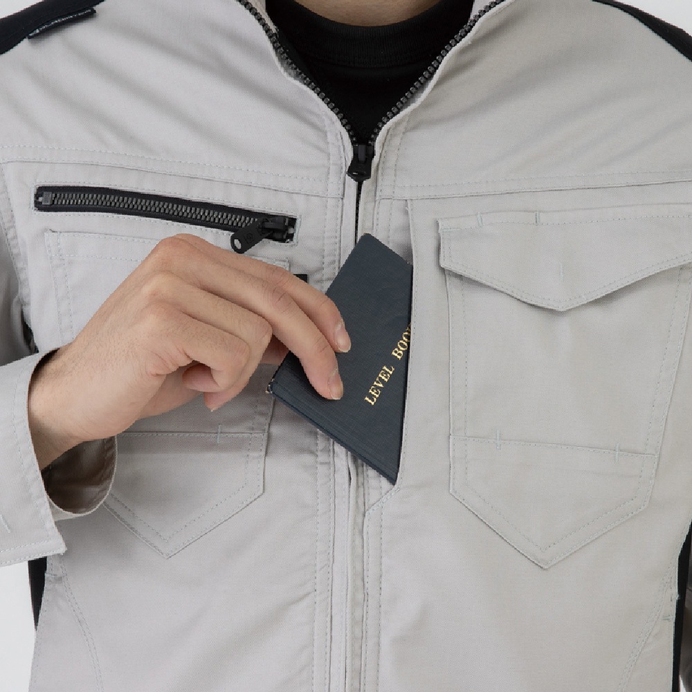 SS~6Lまで幅広いサイズに対応 SS・Sはユニセックスサイズ 背中と両袖には視認性を高める反射素材使用 左胸には野帳も入る縦型ポケット 右胸には野帳も入るファスナーポケット 両袖には太ペンも入るマルチポケット 両脇は大容量ポケット ウエスト部分はお腹のふくらみでフロントが閉まらない場合でもボタンを外せば閉めやすくなるサイドベンツアジャスター