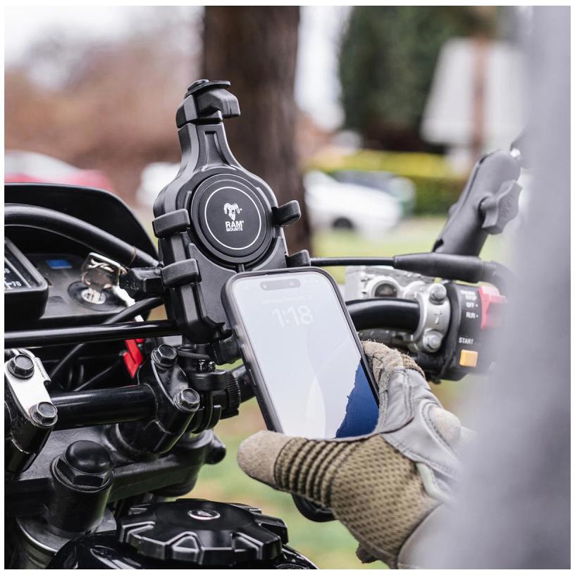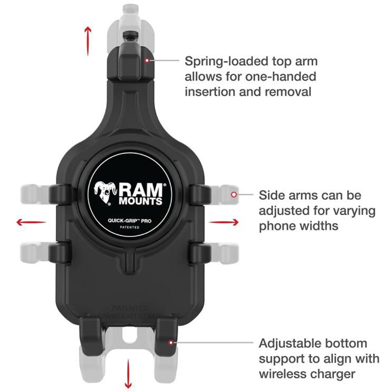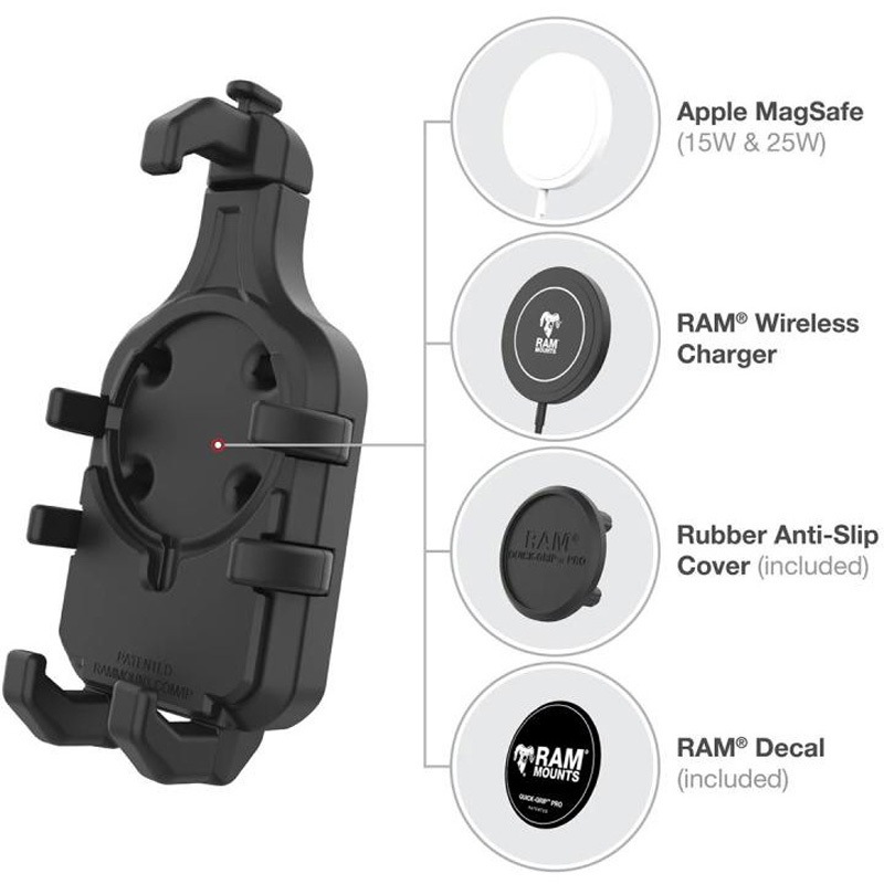 メーカー名:ラムマウント メーカー品番:RAM-B-149Z-A-PD5U ラムマウントのクレイドルスマホホルダー”Quick Grip”のハイエンドモデル、”Quick Grip Pro”。片手でデバイスを脱着でき、走行中もズレなくホールド。Apple社MagSafe充電器(29W仕様)などを背面に仕込んでワイヤレス充電機能を追加可能。アジャスタブル下部アームにより、ワイヤレス充電器とデバイス背面の位置合わせや再度ボタンやポートへのアクセス確保も可能。ワイヤレス充電器なしでももちろん使用できます。オープンコクピットにて使用する場合のテザー付属。 販売備考:*使用するワイヤレス充電器の防水スペックをご確認ください。*適合サイズ確認の際はスマホカバーなども考慮ください。