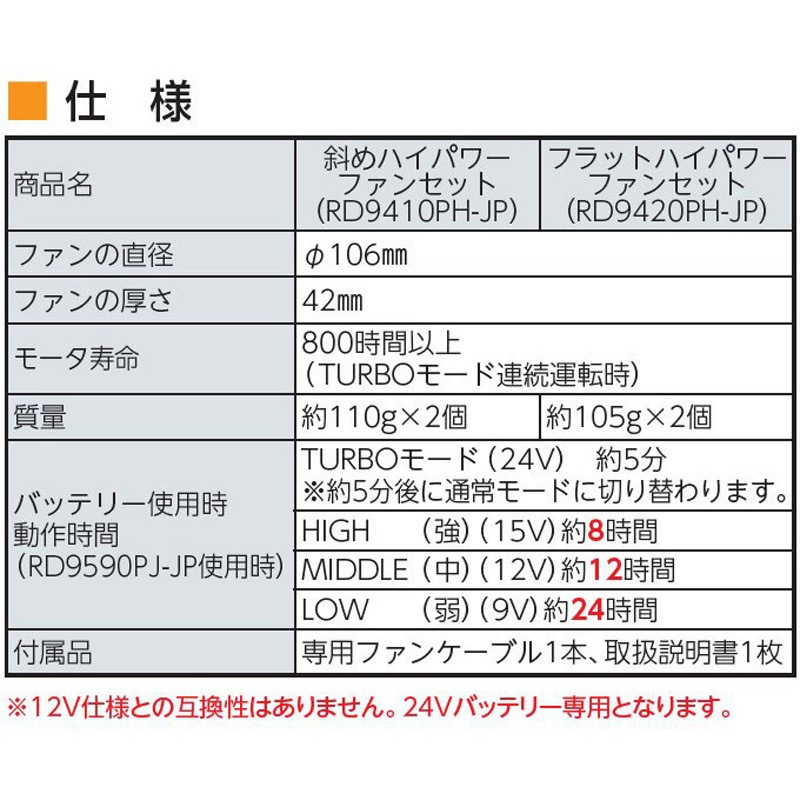 ファン対応ウェア用のファンです 風向きを変えることができる斜め設計 24V仕様のRD9590PJ-JP/RD9390PJ-JPのバッテリーとあわせてご使用ください(12V仕様バッテリーとの互換性はありません) 風向きを変えることができる斜め設計!