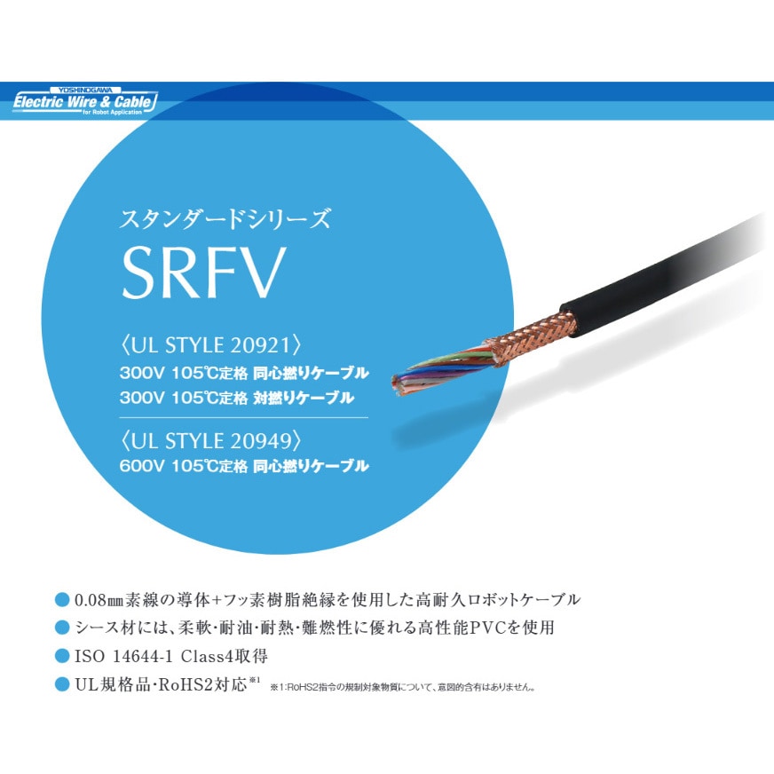 0.08mm素線の導体+フッ素樹脂絶縁を使用した高耐久ロボットケーブル シース材には、柔軟・耐油・耐熱・難燃性に優れる高性能PVCを使用 ISO 14644-1 Class4取得 UL規格品・RoHS2対応 ※:RoHS2指令の規制対象物質について、意図的含有はありません。