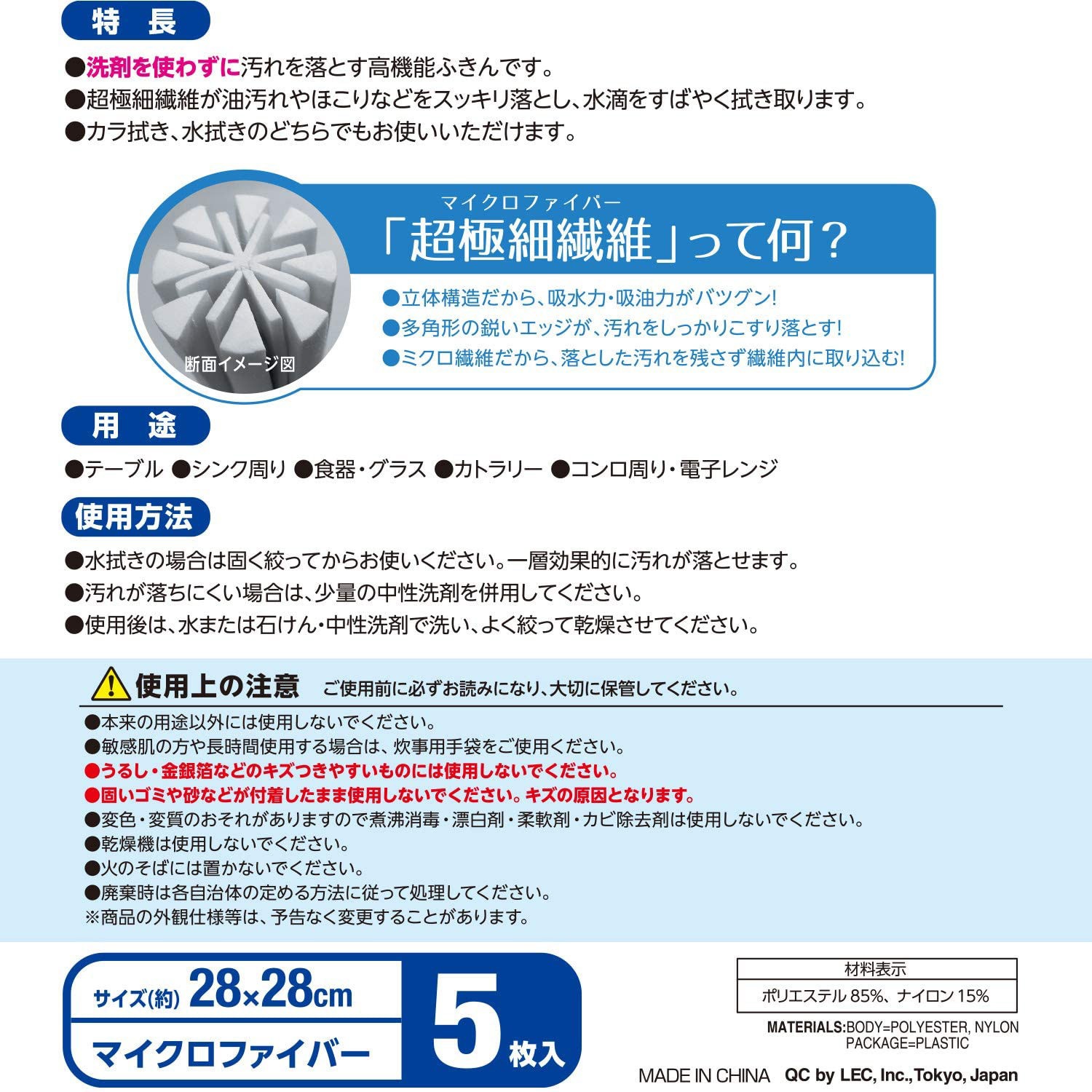超極細繊維パワーでスピード吸水!洗剤を使わずに汚れを落とす高機能ふきんです。超極細繊維が油汚れやほこりなどをスッキリ落とし、水滴をすばやく拭き取ります。食器・テーブル・シンク周りなどに。お徳用の5枚入りです。