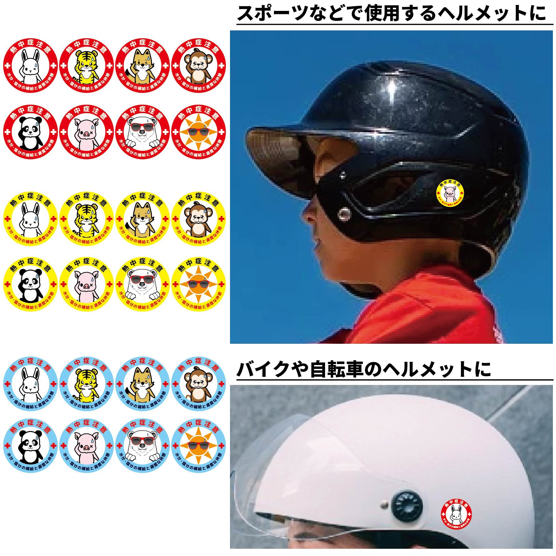 熱中症注意ヘルメットステッカーマル型は、シンプルで分かりやすいデザインです。ヘルメットに貼るだけで、熱中症の注意喚起としてご使用いただけます。同柄のデザインで四角型タイプのステッカーもございます。ラミネート加工が施されており、耐久性があります。