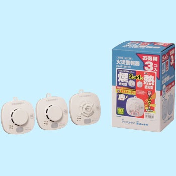 付属品取付ネジ×2本、石こうくぎ×3本、取付板×1個、引きひも×1本、取扱説明書(保証書付)仕様煙式2台、熱式1台種別FA-S1/光電式住宅用防災感知器、FA-H1/定温式住宅用火災警報機色ホワイトアイボリー質量(g)FA-S1/約110、FA-H1/約100(電池含む)使用温度範囲(℃)0~40(結露しないこと)外形寸法(mm)100×100×41.5(引掛けフックを除く)電源リチウム一次電池(定格:3V、1600mAh)×1本機能電池が少なくなると光と音でお知らせ、自動試験機能で故障と判断した際に光を音でお知らせ電池寿命約10年動作表示灯テストボタン内側、火災時:点滅(0.5秒点灯、0.5秒消灯の繰り返し)鑑定型式番号FA-S1/鑑住第19~77号、FA-H1/鑑住第20~3号警報機能停止:テストボタンと兼用、警報停止保持時間/約14分間(14分経過後も警報状態継続中の場合は再鳴動)警報音・音量ブザー警報「ピー ピー ピー」・70dB以上(メーカー測定値:最大90dB)試験機能煙・熱感知部の故障を検出し、動作表示灯の点滅と警報音の鳴動を行う感知方式火災:FA-S1/光電式(散乱光方式)、FA-H1/定温式