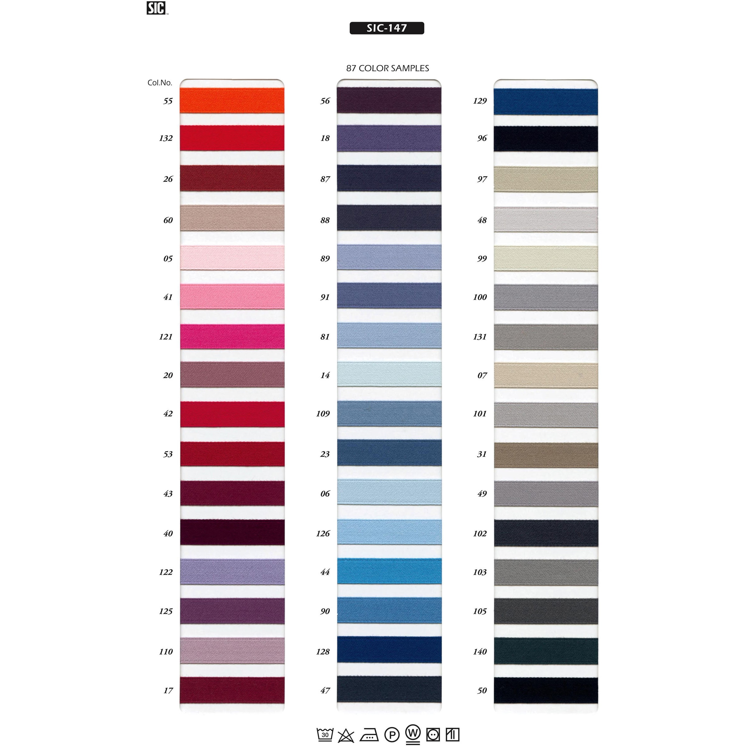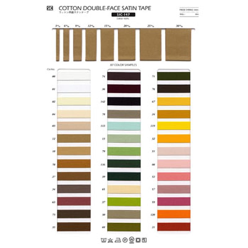 8サイズ×87色 綿100%の両面サテンリボンです。 シルケット加工を施した極細の糸を使用。控えめな光沢があり、滑らかで柔らかい質感があります。