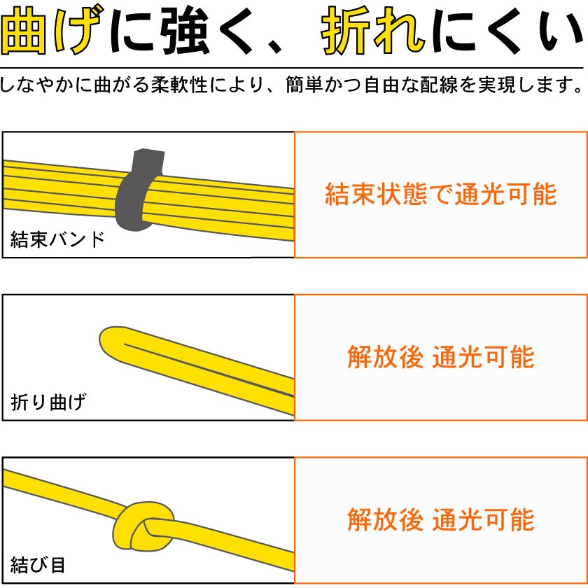 ●シングルモード光ケーブルです。●屋内で使用可能な光ファイバケーブルです。●曲げに強く、折れにくい。しなやかに曲がる柔軟性により、簡単かつ自由な配線を実現します。