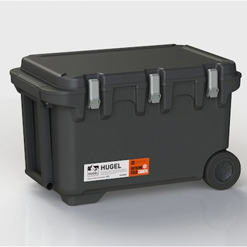 冷蔵庫の仕組みを利用した真空断熱パネルを採用しています。真空断熱パネルと高密度発泡ウレタンの2つの機能を掛け合わせることで、高い断熱性と持続する保冷力を実現しました。ハンドルとタイヤが付き、大容量でも移動がらくです。