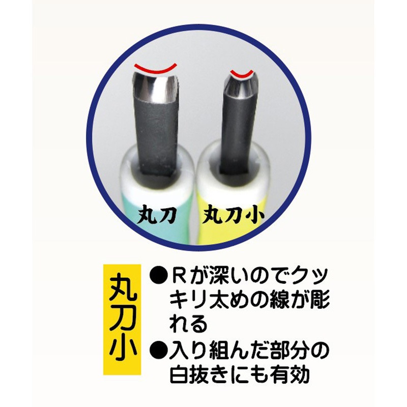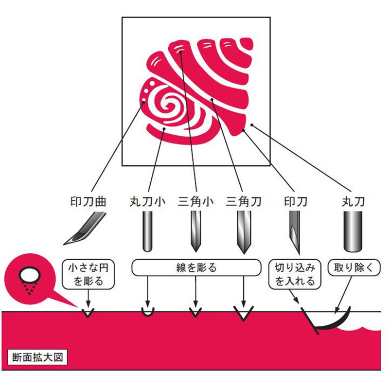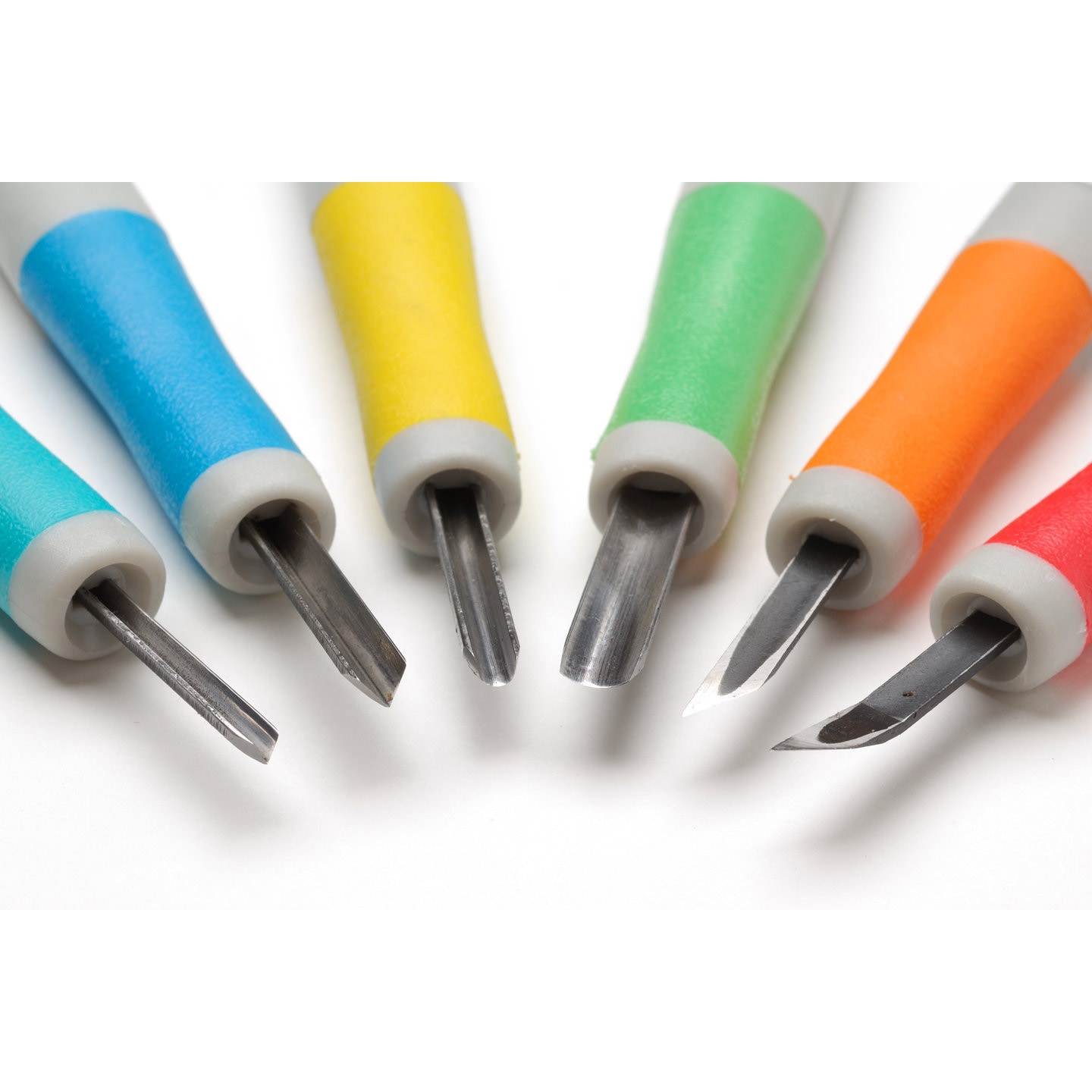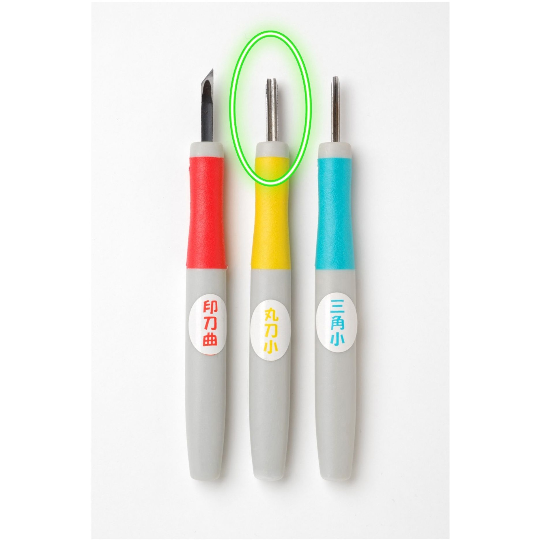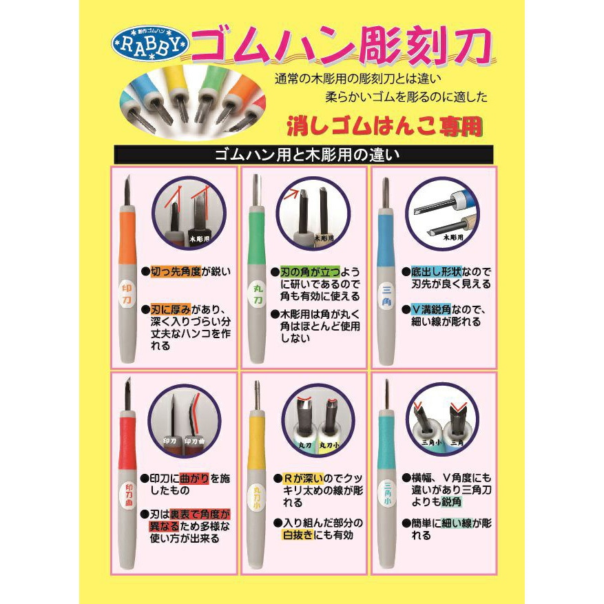 消しゴムはんこ専用オリジナル彫刻刀。刃先によってハンドルが色別にしており見分けやすい。フィット感抜群のラバークリップを採用