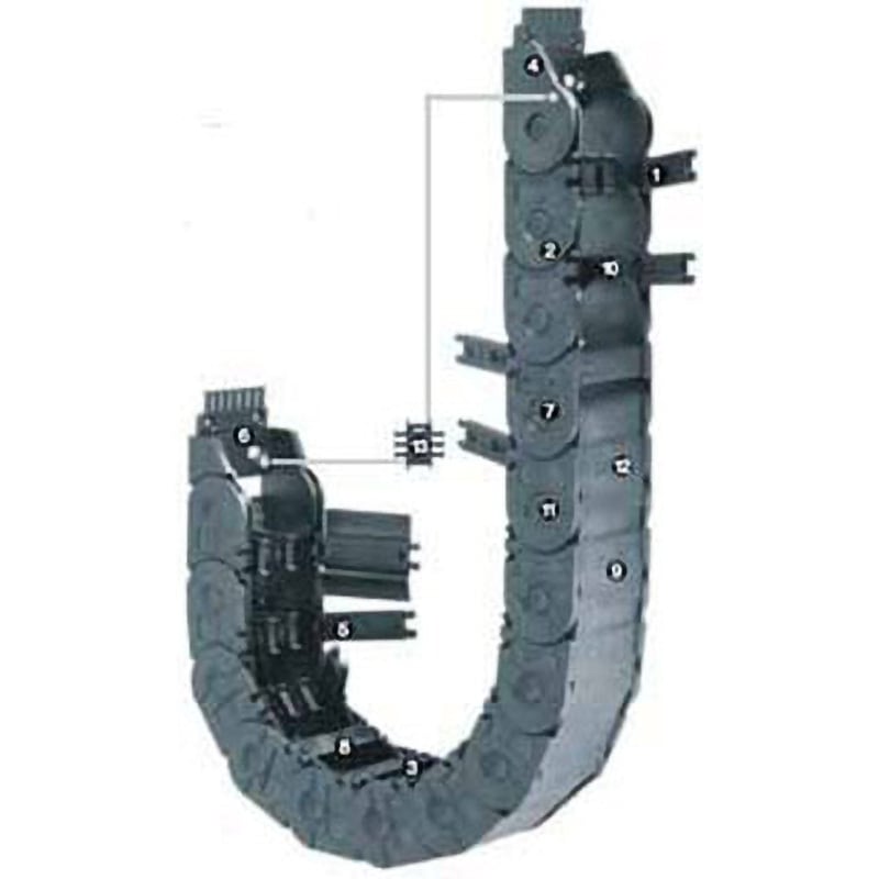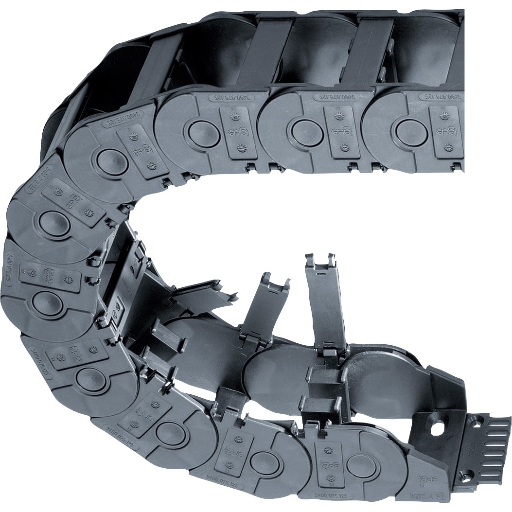産業機械装置の可動部で、可動ケーブルやホースを保護・ガイドする高性能樹脂ケーブル保護管です。 組み立てが簡単で耐久性があり、動作も静かです。 大きな内高さと高い安定性を備えています。