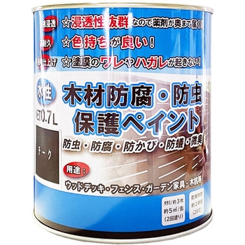 用途木材保護塗料仕様水性→乾燥が早い・臭いが少ない・安全性が高い・作業性が良い・環境に優しい (低 VOC)、油性→乾燥が遅い・臭いが強い・安全性が低い・作業性が悪い・環境に優しくない[※この様に違いがあります。水性を使わない理由はありません!他にはないシロアリ対策!木材内部から守ります!JIS規格に基づいた正式な防蟻試験をクリアした従来品をベースにした改良品!浸透性抜群! 内部まで薬剤が行き渡り長時間効果が持続!防腐・防虫・防カビにも効果があります!100年以上の歴史を持つ木材防腐・防虫剤メーカー吉田製油所の安心安全の木材防腐・防虫剤です!]使用方法使用前に中身をよく混ぜて均一にして下さい。塗装前に塗る面のホコリ、汚れ、油分、カビ等を取って下さい。ニスやペンキ等の古い塗膜はサンドペーパー等で完全に削り落として下さい。薄めずにそのままお使い下さい。使い終わった刷毛や用具は新聞紙等で塗料を拭き取り、水で洗って下さい。残った塗料はしっかりとフタをし直射日光を避け、また凍結しないよう注意して保管して下さい。噴霧器による塗装はできません。色チーク種類水性 木材防腐・防虫保護ペイント容量(L)0.7危険等級Ⅲ危険物の類別第四類危険物の品名第二石油類危険物の数量0.7L油性 or 水性水性危険物の性状非水溶性