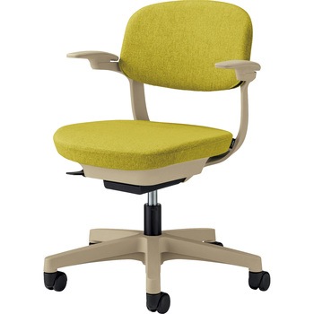 リビングテイストなカジュアルワークチェアー。体格差に応じてロッキング反力を自動で調節します(セルフアジャストロッキング)。座面右側のレバー1本で背・座の調節が完結します。