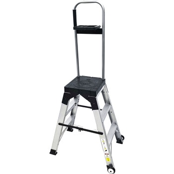 ・天板が広く乗ることが出来て、手摺がある安心安全な脚立です。・小物トレーが付いており、作業時いちいち降りる必要がありません。・滑車が付いており、持ち運び用意です。・1台から出荷可能です。・特許取得製品です。・三井住友海上火災保険の損害保険に加入しております。
