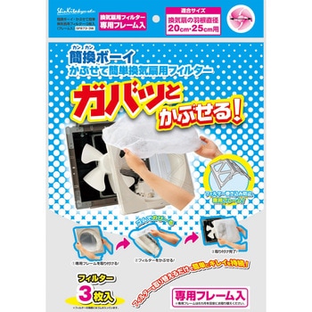 ガバッとかぶせる!かぶせて簡単換気扇用フィルター羽根の直径20cm・25cm用。フィルターの周囲にゴムが入っているのでガバッとかぶせるだけ。フィルター巻き込み防止専用フレーム1個付。