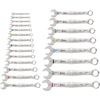 Joker6003は7.5°の回転口とダブルヘックス形状の組み合わせにより、接触面を倍増させます。ネジ締め時にレンチを長手軸の周りに180°回転させることで4ヶ所の取り付けが可能になり、ボルトやネジの頭を15°ごとに固定することができます。特に狭い場所でのネジ締めが非常に容易です。スリムで頑丈なメガネ部はツール軸に対して15°傾斜しています。高品質な表面処理により高い耐食性が長期間持続します。"Take it easy"色分けシステムによりサイズ別に色分けされています。ストリップ端子はツールをしっかり保持します。強力なマグネットによりストリップは金属表面にしっかりと固定されます。レールは壁にボルトで固定することができます。コンビネーションレンチ8点セット、ミリサイズ、端子ストリップが付いています。