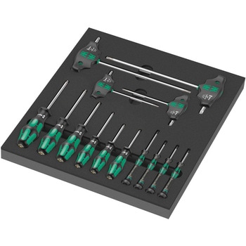 耐久性のあるフォームインサート。欠落した部品を素早く識別できるように 2 色で表示されます。化学蒸気を含まない高品質で耐久性のあるフォームインサート。フォームインサートからツールを最大限に取り外すための最適なフィット感。撥水・撥油性に優れ、メンテナンスの手間がかからず、お手入れも簡単です。工具を汚れや衝撃から守ります。高速作業速度を実現するハードゾーンと、高トルク伝達を実現するソフトゾーンを備えた8本のクラフトフォームプラスドライバー。高速回転用の回転キャップ付きクラフトフォームマイクロドライバー。特に大きな締め付けおよび緩めのモーメントを伝達するためのTハンドルドライバー。トルクス凹ねじの保持機能。
