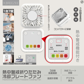 冷却プレートを搭載し肌へ直接当て効率よくひんやり!本体に温度計と熱中警戒レベルが表示されるため、感覚だけでなく、数値で危険を察知外出先から室内まで、1台7役であらゆるシーンをカバー