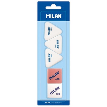 スペインの文房具メーカー MILAN(ミラン)の『消しゴム NO.4045&NO.430 5個セット』です。4045、430 どちらもMILANの定番ロングセラー消しゴム。柔らかな消しゴム。シンプルでありながら、計算されたロゴバランスがとてもおしゃれです。あらゆる紙面の鉛筆ストロークを消してくれます。おしゃれな個別ブリスターパッケージ。文房具好きのお子さま、お友達へのプレゼントに最適です。消しゴムのカラーは指定できません。何卒ご理解ください。