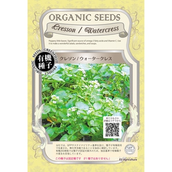 肉料理によく合う、ピリっとした味わいの野菜です。湿気を好むので、お水をたっぷりあげて育てましょう。比較的カンタンに育つので、菜園ビギナーさんにもおすすめです!ウォータークレスはヨーロッパからアジアが原産。イギリスでは19世紀初頭にウォータークレスの栽培が始まったと言われています。イギリス、ウィンチェスター近郊のアルレスフォードという町では、ウォータークレスフェスティバルが行われ、毎年1万5千人以上が訪れています。産地にちなんで蒸気機関車が走る「ウォータークレス線」なるものまであります。(ちなみに期間限定で機関車トーマスもそこを走るとか!)アメリカでは1940年代にアラバマ州で栽培が始まり、今ではフロリダ州のオビエドが【世界のウォータークレスの首都】とうたわれるほどウォータークレスの生産が盛んな町になりました。【効能】ビタミンA、ビタミンCに加え、鉄分、カルシウム、ヨウ素、葉酸が豊富。ビタミンCが豊富なため、17世紀のイギリス軍では壊血病予防にウォータークレスが採り入れられていたというほど。また、注目すべきはオメガ3脂肪酸が豊富なこと。ウォータークレスはオメガ3(主に16:3n-3多価不飽和脂肪酸)が豊富で100g中45mg含まれています。抗酸化作用、利尿作用、咳・タンを鎮める効果、消化促進作用があります。また、ウォータークレスに含まれるフェネチルイソチオシアネートにより、血管新生抑制によるがん抑制効果が確認されており、特に肺がんに効果があると広く信じられています。2010年サウスハンプトン大学では、ウォータークレスの摂取により乳がんの増殖を防ぐ効果があるとの研究結果を発表しました。【楽しみ方】ウォータークレスは、ガーデンクレス、マスタードやラディッシュなどと同じブラシカ属の野菜。スパイシーでほろ苦く、ピリッと刺激的な風味が特徴です。なんとも大人の野菜。ほろ苦くさわやかなテイストが、肉料理にピッタリ。また、サラダにしたり、スープに入れたり、ソテーにしたりと幅広く楽しめますよ!【栽培方法】種まき:直播 播種適期:4月~5月、9月~10月場所:湿った土壌を好み、高温乾燥を嫌います。水やり:水はけの良い土で水をたっぷりやって育てます。水耕栽培もできます。収穫:収穫の目安は種まきから60~80日です。【ヨーロッパ有機認証取得のオーガニックシード(有機種子) 】この種子は、世界の有機基準でも厳しいとされるヨーロッパ有機認証1を取得しています。種子を育成、生産する過程においても、農薬や化学肥料を使用せず、環境への負荷をできる限り低減して生産されています。農薬・化学肥料を使用していません。採取後の種に消毒していません。遺伝子組換を行っていません。1:「EC-regulations No 834/2007およびNo 889/2008」2:種の育成(生産)期間中。3:一部の農薬を製剤化した微生物農薬等は生物的防除手段として使用が認められています。