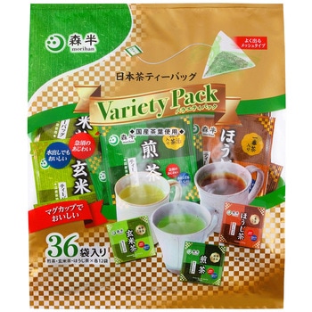 気分やシーンによって、使い分けられるバラエティパック。普段使いしやすいティーバッグタイプの煎茶・玄米茶・ほうじ茶を詰め合わせました。【厳選素材を使用したプレミアムなバラエティパック】 宇治抹茶入り煎茶 ・宇治抹茶で鮮やかな緑色に。・煎茶を追い火仕上げで芳醇な香りに。・極強火で香味を引き立てた一番茶かりがね使用。 宇治抹茶入り玄米茶 ・宇治抹茶でまろやかな味に仕上げました。・煎茶を強火仕上げ風味ゆたかに。・国産うるち米で芳ばしく甘みのある味わいに。 一番茶入りほうじ茶 ・芳醇な香りにこだわった一番茶入り。・碾茶の葉脈をブレンドし風味をプラス。【マイボトルやマグカップにも使いやすい】糸が長いので、マグカップはもちろんマイボトルにも使いやすい!マイボトルに氷と水、ティーバックを入れれば通勤中に美味しい水出し茶ができます。抽出が早い三角ティーバッグ!抽出性を上げる三角ティーバッグを使用し、時間がかかりがちな水出しのお茶でも茶葉がひろがりやすいので、美味しさそのまま素早く抽出。【持ち運びにも便利な個包装】鮮度を守るために窒素ガスを充填し1煎ずつ個包装に。持ち運びにも便利で外出先や職場でも美味しい煎茶が楽しめます。【京都・宇治 森半のご紹介】 1836年創業。江戸時代より日本茶の伝統とともに歩み続けてきました。天保7年(1836年)、玉露・抹茶の産地として名高い宇治・小倉の地で茶を生業としてきた森半。 全国茶審査技術競技大会に2度優勝し、名実ともに日本屈指の茶師が厳選した良質の茶葉、積極的な新技術の導入など、つねに高い品質の日本茶づくりに専念。わたしたちは「信頼されるお茶の品質」「お茶を通しての、うるおいある生活への貢献」を追求し続けます。 いつの時代にも「信頼される品質」を高い安全性および高い品質の商品づくりを実現するため、国際的な食品安全認証を取得するなど積極的な取組を進めています。さまざまな設備・技術を駆使して細菌検査や理化学検査を実施し、人間の五感と科学的根拠の両面から「信頼」され「安心」いただける商品作りをサポートし、日々の品質改善・向上にむけた取り組みを行っています。