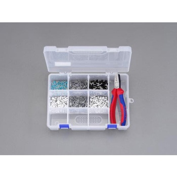 セット内容: ターコイズ 適合電線サイズ:0.34mm2、先端サイズ:Φ0.8×8mm、全長:12.5mm、ホワイト 適合電線サイズ:0.5mm2、先端サイズ:Φ1.1×8mm、全長:13.5mm、ホワイト 適合電線サイズ:0.5mm2、先端サイズ:Φ1.1×10mm、全長:15.5mm、グレー 適合電線サイズ:0.75mm2、先端サイズ:Φ1.3×8mm、全長:14.0mm、グレー 適合電線サイズ:0.75mm2、先端サイズ:Φ1.3×10mm、全長:16.0mm、ブラック 適合電線サイズ:1.5mm2、先端サイズ:Φ1.7×8mm、全長:14.5mm。フェルール端子各100個、145mm 圧着ペンチ(EA538KC-2)×1本。