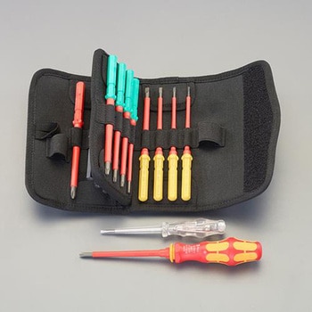 セット点数:16点。セット内容:・98mm 絶縁ドライバーハンドル、・#1 x157mm [+]絶縁ドライバービット、・#2 x157mm [+]絶縁ドライバービット、・2.5 x157mm [-]絶縁ドライバービット、・3.5 x157mm [-]絶縁ドライバービット、・4.0 x157mm [-]絶縁ドライバービット、・5.5 x157mm [-]絶縁ドライバービット、・T10 x157mm [Torx]絶縁ドライバービット、・T15 x157mm [Torx]絶縁ドライバービット、・T20 x157mm [Torx]絶縁ドライバービット、・T25 x157mm [Torx]絶縁ドライバービット、・PZ1 x157mm [Pozi]絶縁ドライバービット、・PZ2 x157mm [Pozi]絶縁ドライバービット、・PZ/S1x157mm [Pozi/-]絶縁ドライバービット、・PZ/S2x157mm [Pozi/-]絶縁ドライバービット、・検電(-)ドライバー 0.5×3.0mm(AC150V~250V)、・ホルダー。