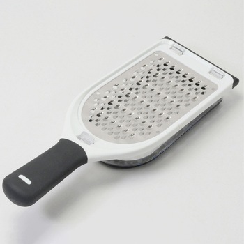 「細め」極細千切り・「太め」ふんわり薄い!両面で細・太2種類の千切りができます。特殊加工の鋭い刃で抵抗が少なくおろしやすいです。おろした後はそのまま食卓へ、 ワンタッチで外せるケース付き。端にはすべりにくいストッパーが付いているので、容器を使用しない場合でもおろしやすい仕様です。握りやすく、滑りにくい太グリップです
