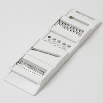 包丁を使わず下ごしらえができる。おろし・スライス・千切り・ツマ切りが1台で可能。安全ホルダー・ピーラー付き。ワイドなプレートで大きめ野菜もOK。容器は受け皿としても使用可。傾斜のあるプレートベースなのでおろし・スライスがラクラク。