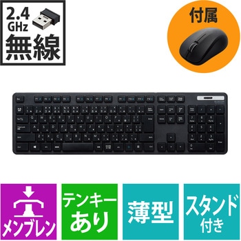 セット内容無線薄型フルキーボード×1、無線BlueLEDマウス×1、共通レシーバー×1、動作確認用単4形アルカリ乾電池×1、動作確認用単3形アルカリ乾電池×1、ユーザーズマニュアル×1色ブラック質量(g)【キーボード】約505※電池含まず、【マウス】約57※電池含まず、【レシーバー】約2電源【キーボード】単4形アルカリ乾電池、単4形マンガン乾電池、単4形ニッケル水素2次電池のいずれか1本対応OSWindows 11、Windows 10、Windows 8.1、Windows 7、Windows XP ※各OSの最新バージョンへのアップデートや、サービスパックのインストールが必要になる場合があります。コネクタ形状USB(A)オス対応機種USBポートを装備したWindows OS搭載機分解能【マウス】1600カウント対応【マウス・レシーバー収納】対応外形寸法(幅W×奥行D×高さH)(mm)【キーボード】441.5×127.6×25.0(スタンド含まず)、441.5×127.6×33.5(スタンド時)、【マウス】59.3×100×37.8、【レシーバー】19.5×15.8×6.5通信方式GFSK方式インターフェースUSBキー配列109キー(日本語配列)LED色【マウス】ブルー保証期間6カ月間キー方式メンブレンキーストローク(mm)2.5ボタン数【マウス】3個 ※ホイールボタン含む電波到達距離(m)磁性体(鉄の机など)の上で使用する場合:約3、非磁性体(木の机など)の上で使用する場合:約10※メーカー環境でのテスト値であり保証値ではありません。連続動作時間【マウス】約384時間キーピッチ(mm)19連続待機時間【マウス】約1041日ホイール数【マウス】1個電池使用可能期間【キーボード】アルカリ乾電池使用時の目安 約2年 ※メーカーテスト値、【マウス】約2年 ※1日8時間のパソコン操作中5%をマウス操作に割り当てた場合ホットキー数12キー読取方式【マウス】光学センサー方式電波周波数2.4GHz帯