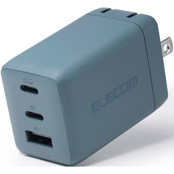 USB Type-C(TM)(USB-C(TM))ポートとUSB Type-Aポートの合計3ポートを搭載し、iPhoneなどのスマートフォンと完全ワイヤレスイヤホンとWindowsなどのノートパソコンを3台同時充電できるUSB AC充電器です。小型・軽量なので外出や出張などの際の持ち運びに便利です。USB Type-C(TM)(USB-C(TM))ポートとUSB-Aポートの合計3ポートを搭載し対応するスマートフォン、タブレット、ノートパソコンなどを充電できる、GaN(窒化ガリウム)を採用し小型で軽量なUSB AC充電器です。※USB Power Delivery規格65Wまでで充電できる機器に限ります。出力端子が3ポートあるので、iPhoneなどのスマートフォンと完全ワイヤレスイヤホンとWindowsなどのノートパソコンを3台同時充電できます。※2ポート以上同時出力時は合計最大65Wとなります。USB Type-Cポートは、USB Power Delivery規格、オプションのPPS(Programmable Power Supply)規格に対応し、同規格に対応するノートパソコンやスマートフォン、タブレットなどを充電可能です。USB Type-Cポート単独使用時、機器に応じて出力が5V/3A、9V/3A、12V/3A、15V/3A、20V/3.25Aと可変し、iPhoneなどのスマートフォンから、iPadなどのタブレット、高性能なWindowsノートパソコンまで幅広く充電できます。USB-Aポートは、最大出力12W(5V2.4A)でスマートフォンや完全ワイヤレスイヤホン、スマートウォッチなどを充電、給電ができます。接続された機器を自動的に見分けて適した出力で充電できる”おまかせ充電”に対応しています。小型・軽量なので外出や出張などの際の持ち運びに便利です。未使用時は、電源プラグを折りたたんで充電器本体に収納できるので持ち運びにも便利です。耐トラッキング性の要求事項(PSE:電気用品安全法)を満たしたコンセントプラグを採用しています。USB Power Delivery(パワーデリバリー)とは、アダプターと接続機器間で情報をやり取りすることで、その機器間における最適な電力を選択し、高速充電を実現するUSB規格です。本製品はUSB-IFのテストと同等のテストをメーカー独自で実施し、高い安全性が保たれており、USB Power Delivery対応製品にご使用いただけます。PPS(Programmable Power Supply)とは0.2V単位で電圧を調整し、最適な電力で効率的に供給することができるUSB Power Delivery 3.0のオプション規格です。※本製品のUSB Power Delivery最大出力は65Wです。PPS(Programmable Power Supply)最大出力は45Wです。※本製品にケーブルは同梱しておりません。別途MFi認証品のUSB Type-C - Lightningケーブルや、エレコムのUSB規格認証USB Type-C - USB Type-Cケーブル等をご用意ください。※機器本体や充電器が濡れた状態で充電すると、異常な発熱・焼損の原因となり大変危険ですのでおやめください。※USB Type-C and USB-C are trademarks of USB Implementers Forum自社環境認定基準を1つ以上満たし、『THINK ECOLOGY』マークを表示した製品です。廃棄物削減に取り組み、製品に同梱する取扱説明書等をペーパーレス化した製品です。環境保全に取り組み、製品の包装容器におけるプラスチック重量を、社内基準製品より20%以上削減した製品です。環境保全に取り組み、製品の包装容器が紙・ダンボール・ポリ袋のみで構成されている製品です。