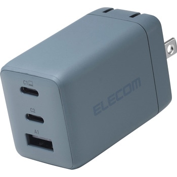 USB Type-C(TM)(USB-C(TM))ポートとUSB Type-Aポートの合計3ポートを搭載し、iPhoneなどのスマートフォンと完全ワイヤレスイヤホンとWindowsなどのノートパソコンを3台同時充電できるUSB AC充電器です。小型・軽量なので外出や出張などの際の持ち運びに便利です。USB Type-C(TM)(USB-C(TM))ポートとUSB-Aポートの合計3ポートを搭載し対応するスマートフォン、タブレット、ノートパソコンなどを充電できる、GaN(窒化ガリウム)を採用し小型で軽量なUSB AC充電器です。※USB Power Delivery規格65Wまでで充電できる機器に限ります。出力端子が3ポートあるので、iPhoneなどのスマートフォンと完全ワイヤレスイヤホンとWindowsなどのノートパソコンを3台同時充電できます。※2ポート以上同時出力時は合計最大65Wとなります。USB Type-Cポートは、USB Power Delivery規格、オプションのPPS(Programmable Power Supply)規格に対応し、同規格に対応するノートパソコンやスマートフォン、タブレットなどを充電可能です。USB Type-Cポート単独使用時、機器に応じて出力が5V/3A、9V/3A、12V/3A、15V/3A、20V/3.25Aと可変し、iPhoneなどのスマートフォンから、iPadなどのタブレット、高性能なWindowsノートパソコンまで幅広く充電できます。USB-Aポートは、最大出力12W(5V2.4A)でスマートフォンや完全ワイヤレスイヤホン、スマートウォッチなどを充電、給電ができます。接続された機器を自動的に見分けて適した出力で充電できる”おまかせ充電”に対応しています。小型・軽量なので外出や出張などの際の持ち運びに便利です。未使用時は、電源プラグを折りたたんで充電器本体に収納できるので持ち運びにも便利です。耐トラッキング性の要求事項(PSE:電気用品安全法)を満たしたコンセントプラグを採用しています。USB Power Delivery(パワーデリバリー)とは、アダプターと接続機器間で情報をやり取りすることで、その機器間における最適な電力を選択し、高速充電を実現するUSB規格です。本製品はUSB-IFのテストと同等のテストをメーカー独自で実施し、高い安全性が保たれており、USB Power Delivery対応製品にご使用いただけます。PPS(Programmable Power Supply)とは0.2V単位で電圧を調整し、最適な電力で効率的に供給することができるUSB Power Delivery 3.0のオプション規格です。※本製品のUSB Power Delivery最大出力は65Wです。PPS(Programmable Power Supply)最大出力は45Wです。※本製品にケーブルは同梱しておりません。別途MFi認証品のUSB Type-C - Lightningケーブルや、エレコムのUSB規格認証USB Type-C - USB Type-Cケーブル等をご用意ください。※機器本体や充電器が濡れた状態で充電すると、異常な発熱・焼損の原因となり大変危険ですのでおやめください。※USB Type-C and USB-C are trademarks of USB Implementers Forum自社環境認定基準を1つ以上満たし、『THINK ECOLOGY』マークを表示した製品です。廃棄物削減に取り組み、製品に同梱する取扱説明書等をペーパーレス化した製品です。環境保全に取り組み、製品の包装容器におけるプラスチック重量を、社内基準製品より20%以上削減した製品です。環境保全に取り組み、製品の包装容器が紙・ダンボール・ポリ袋のみで構成されている製品です。