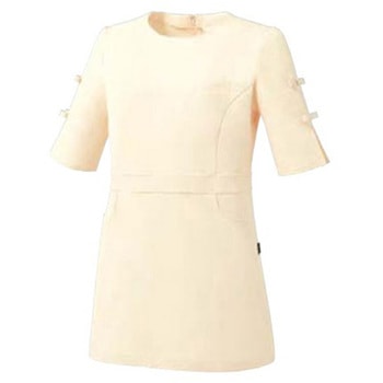 ストレッチ性に優れ、動きやすさが特徴のトリコット素材。通気性も良く、柔らかい肌ざわりで、日々快適に過ごせます。型くずれしにくく、シワにもなりにくいので、清潔感を保てます。袖のリボンがアクセントに、オリジナルピスネーム付、袖のリボン使いとウエストシェイプで女性らしさが際立つチュニック。