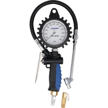 大きく見やすい3インチ大型文字盤。簡単レバー操作で、タイヤの空気圧測定・増圧・減圧が可能。乗用車、トラックのタイヤ空気圧が計れるダブルチャック採用。(アルミホイールなどの狭い箇所でも計れる小口径ダブルチャック)持ちやすいラバーグリップハンドルを採用。
