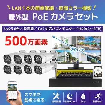 画像認識によるAI機能により人のみ検知する防犯カメラ。 境界線を超えるとアラーム通知する「警報線」や侵入禁止エリアに入るとアラーム通知する「警報区域」の設定ができる。「警報区域」については、L字やコ字など多角形にも対応し、人の動きや場所に合わせた細かな設定が可能。800万画素(4k)の高画素対応。LANケーブル経由で電気を供給するので、電源を取れない場所にもカメラを設置可能で配線がすっきりする。(省配線)赤外線カメラで夜間撮影にも対応。(夜間時はモノクロ撮影)録画機はサイクル録画機能で常に最新データをハードディスクに保存。タイマー録画や録画スケジュール機能も搭載。