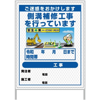 【レンタル】工事看板 イラスト(国交省仕様)ガルバニウム プリズム反射型 1100x1400 水路工事1グリーンクロス