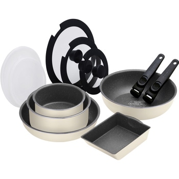 仕様対応熱源:ガスコンロ・ラジエントヒーター・オーブン対応(※IH調理器、電子レンジでは使用できません。)セット内容フライパン26cm、炒めなべ26cm、なべ16cm・20cm、エッグパン、ガラスふた16cm・20cm・26cm、PEシールふた16cm・20cm、専用マルチハンドル2本サイズ(cm)フライパン26、炒めなべ26、なべ16・20、エッグパン14×20、ガラスふた16・20・26、PEシールふた16・20満水容量(L)フライパン26cm:約2.9、炒めなべ26cm:約3.2、なべ16cm:約1.6、なべ20cm:約2.9、エッグパン:約1.1
