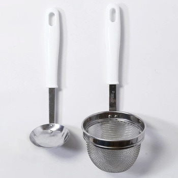 みそこしやだしとりに最適!みそこしと専用お玉のセットです。みそこしは鍋に掛けられるフック付き。お玉はみそをすくいやすい小型サイズです。丈夫で衛生的なステンレス製で、食器洗い乾燥機対応なのでお手入れも簡単