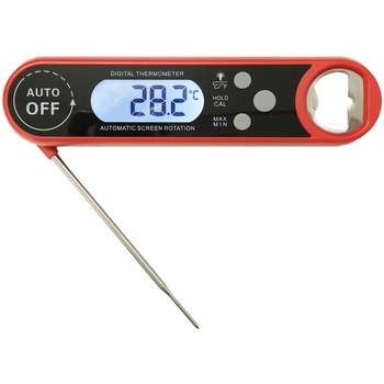 本体の向きに合わせて画面が自動回転するため、利き手を問わず快適にお使いいただけます。本体に栓抜きが付いており、バーベキューやキャンプ等で便利です。防水設計(IP66)なので、本体全体を水洗いできます。強力な内部磁石により、温度計を冷蔵庫やスチール製品にしっかりと取り付けることができ、本体の厚さ18mm、重さも85gとスリム、コンパクトに収納可能です。持ち手からプローブ(計測部)までの距離は160mm。プローブの長さは100mmなので、計測部と手元を離して測定できます。本体部分の材質はABS樹脂です。計測プローブの材質は衛生的で錆びない食品安全304ステンレス鋼です。計測プローブを引き出すと自動的に電源がONになり、引き戻すと自動的に電源がOFFになります。測定範囲は-50℃~+300℃まで。計測した最低/最高温度の記録ができ、確認が出来ます。温度測定時間は約2~4秒と早く計測出来ます。必要に応じて簡単な手順で、測定基準の簡易キャリブレーションが出来ます。折りたたみ式計測プローブは回転致しますので、計測対象物の位置に自由度があります。プローブの先端がわずか1.7mmと細く、食材に刺しやすくなっています。