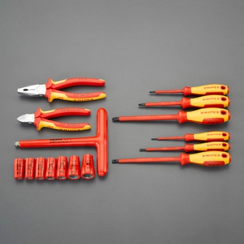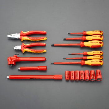 セット内容:17点セット、コンビネーションプライヤー 200mm、ニッパー 160mm、(-)ドライバー 3.5・4.0・5.5mm、(+)ドライバー #0、ラチェットハンドル(1/2”) 265mm、エクステンションバー(1/2”) 125・250mm、(1/2”)ソケット(6P) 10・11・12・13・14・17・19mm、ケーブルナイフ 190mm。1000V絶縁。DIN EN/IEC60900基準に適合。耐衝撃性に優れたプラスチックケース。ツール形状に対応した窪みをつけたスポンジ製マット。固定可能なパーティション。