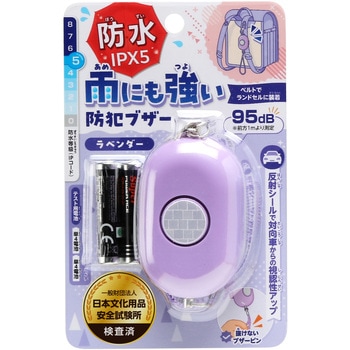 IPX5相当の防水仕様で雨の日でも安心です。ランドセルにしっかり固定できるベルト付き。ピンが抜けきらない紛失防止設計。広角高輝度の反射シール付きで視認性アップ。音量95dB。連続吹鳴時間66分。一般財団法人 日本文化用品 案前試験所 検査済み。