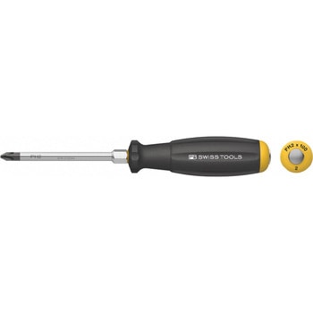 スイスグリップはポリプロピレン・サントプレンの2種の新素材からなるハンドルです。ハンドル形状は人間工学的デザインに基づいたマルチクラフトと同型で、厳選された表面素材は人間の手の硬度に近く、従来のPBハンドルの特性が、軟らかく温かみのあるスイスグリップにより更に引き出されています。ハンドル後部にはドライバーの先端形状のシンボルマークとサイズを表示していますので、作業に適したドライバーをすぐに選ぶことができます。特殊な表面構造により、濡れた手で握っても滑りにくく、さらにオイル・ガソリンに耐性があり、汚れてもきれいに落とせます。
