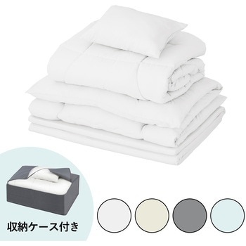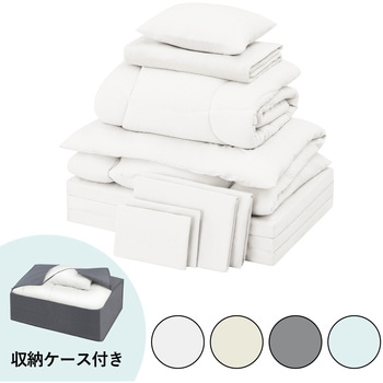 こだわりのフルセットがすぐ揃う!マットレス付き布団10点セットです。掛け布団の中わたは中空ポリエステルわたで、ふんわり軽くあたたかいです。敷き布団はふんわりしたやわらかさで、包み込まれるような寝心地です。マットレスは底付き感を軽減し、程よい硬さで沈み込みを抑え、快適な寝心地をサポートします。マットレスと敷き布団の合わせ使いで厚さ16cm!さらに快適な寝心地となります。マットレスは三つ折り仕様のため、使用しない時にはたたんでコンパクトに収納できます。立てかけて陰干しができるので、湿気対策も簡単に行えます。毛布はフランネル生地で、軽く暖かいです。枕は後頭部から首筋までふんわりやさしく包み込みます。ボックスシーツは全周にゴムがついているので、マットレスと敷き布団をまとめて覆うことができ、着脱が簡単に行えます。ご自宅の洗濯機で洗えます(洗濯ネットの使用をおすすめします)。家庭用の乾燥機対応です。ピーチスキン加工で柔らかくなめらかな肌触りです。低ホルムアルデヒドで、安心の品質です。収納に便利なバッグ付きです。圧縮梱包してあるので、持ち帰りや搬入が簡単です。