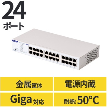 16ポート同様の奥行で、省スペースに設置可能なコンパクトモデル。ファンレスで耐熱50℃に対応し、ループ検知機能も搭載したGiga対応、電源内蔵のメタル筐体24ポートハブです。