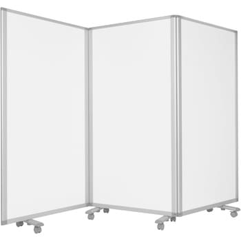 通常はパーテーションとして、お打合せ時はホワイトボードとしても利用できます。マグネットでの掲示も可能。ぴったりたためて省スペースで収納できます。5つのキャスター付ベースで耐震性も高いです。