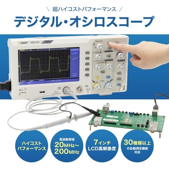 用途波形の分析、高速現象の観測、過渡現象の観測、電気計測、点検用、バグ解析仕様12ビットADC搭載オシロスコープに、周波数カウンタ、電圧計、FFTアナライザ を統合70 - 200MHz 周波数帯域、1.25GSa/s サンプリングレート50M 最大メモリ長、700,000wfms/s 最高波形更新レート、信号をクリアに取り込み可能垂直軸スケール 500uV/div-10 V/div1MポイントFFT解析、周波数成分を正確に表示豊富なトリガタイプ:エッジ、ビデオ、パルス幅、スロープ、ラント、ウインドウ、タイムアウト、N番めエッジ、ロジック、RS232/UART、l2C、SPI、CAN、LIN2チャンネル ハードウェア・デコーディング:RS232/UART、I2C、SPI、CAN、LINマウスやキーボードをサポート、作業効率が向上オプションの Wi-Fi/Bluetooth モジュールでネットワークプリンタをサポート7インチ マルチタッチ・スクリーン質量(kg)約1.5チャンネル数4分解能12ビット外形寸法(幅W×奥行D×高さH)(mm)260×160×78インターフェースHDMI, USBホスト, USBデバイス, トリガ出力(P/F), LAN周波数帯域(MHz)100ディスプレイ7インチ LCDRoHS指令(10物質対応)対応サンプルレート1,2ch使用時:1.25GSa/s、3,4ch使用時:625MSa/sメモリ長さ50M