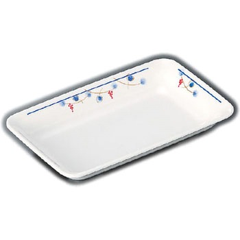 温冷配膳車対応の省スペース設計。収納性や機能性を追及しました。ブルーの絵柄が料理を引き立てます。