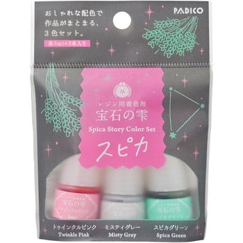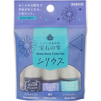 宝石の雫ストーリーカラーセットが新登場。透明感のあるカラー2色と白色が混ざった不透明カラー1色のおしゃれな配色で作品がまとまる3色セット。スピカ、はくちょう座、ほうき星、シリウスの4種類!3ml×3本セットボトルサイズ:Φ18mm×H44mm特徴★おしゃれな配色で作品がまとまる3色セット★春の夜空を伝えるストーリーカラー★発色の良い透明感のあるカラー2色と白色が混ざった不透明なカラー1色の組み合わせで配色に困らない調色しやすい細ノズルレジンと綺麗に混ざる透明感が際立つおしゃれな配色ご注意・製品の特性上、液体が分離しますので、ボトルをよく振ってからご使用ください。・着色剤が濃すぎると UV-LED レジンは硬化しません。UV-LED レジン液約1gにつき、着色剤1~2滴を目安にしてください。・厚みのある作品の場合は、一度に UV-LED レジンを大量に照射せずに、少量ずつ何層かに分けて、UV-LED レジン液の推奨照射時間よりも長めに照射してください。【混ぜて可能な素材】〇UVレジン、LEDレジン、2液性レジン※2液性の成分によっては、着色が変化する場合があります。△シリコーン、発泡ウレタン樹脂※シリコーンの硬化阻害が起きる材質もありますので、事前に予備硬化チェックを行ってください。×粘土、水、エタノール、水性ニス、油性ニス
